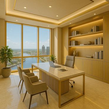 “A modern collaborative hub with flexible meeting rooms, private video conference spaces, and a fully appointed boardroom. The lounge includes access to the outdoor terrace and a beverage bar — designed to inspire productivity and connection.”